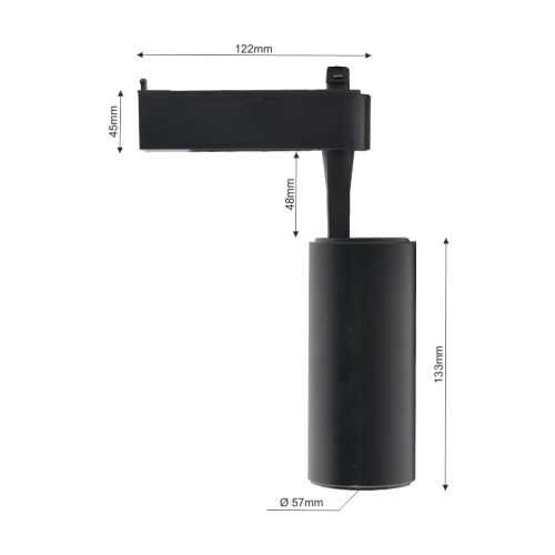 Akcentinio apšvietimo LED šviestuvas. Montuojamas į bėgelį. Pastovios galios maitinimo šaltinis. Korpusas: aliuminis dažytas juodai. Atsparumas aplinkos veiksniams IP20. Komplektuojamas su 3000K LED.