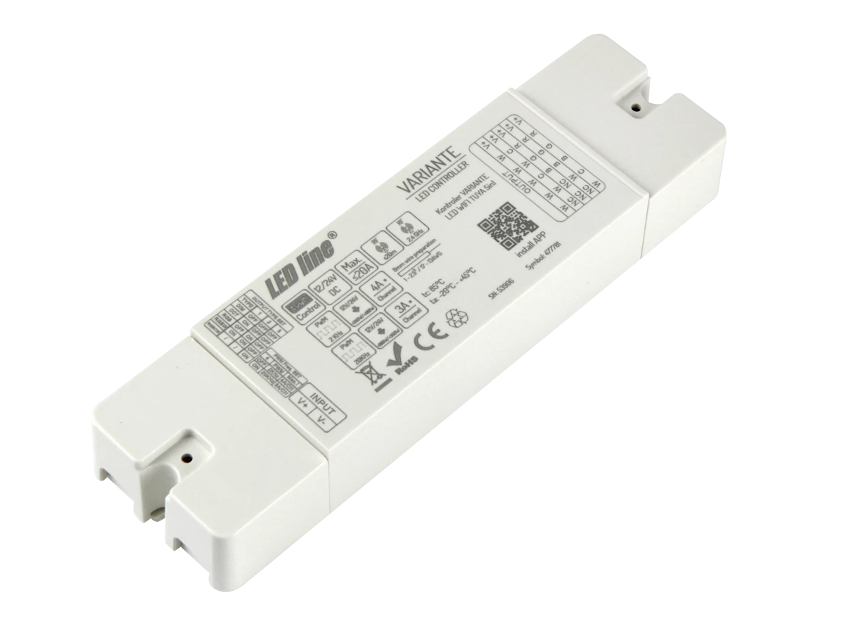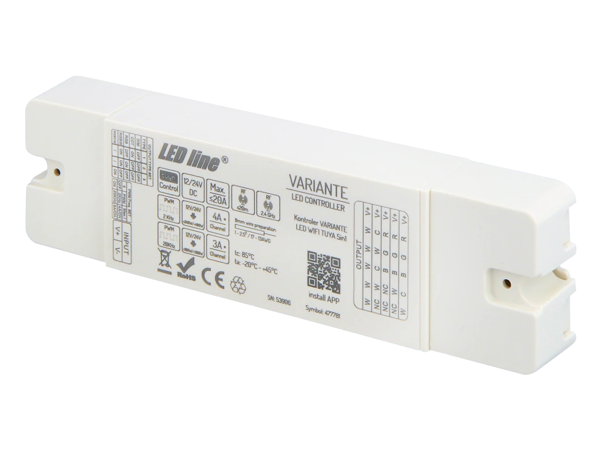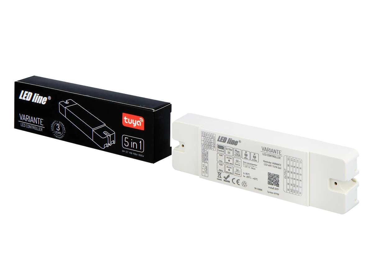 Kontroleris VARIANTE 12V/24V 20A RF WIFI TUYA 5in1 RGBCCT PRIME yra pažangus prietaisas, skirtas valdyti įvairių tipų LED juostas, įskaitant DIM, CCT, RGB, RGBW ir RGBCCT. Dėl galimybės prijungti juostas, maitinamas tiek 12V (iki 240W), tiek 24V (iki 480W), kontroleris siūlo didelę lankstumą naudojime. Prietaisas turi penkis išėjimo kanalus, todėl galima plačiai įrengti apšvietimą.