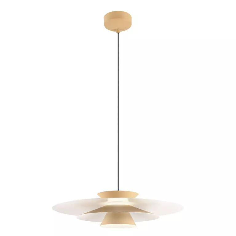 Modernus pakabinamas LED šviestuvas FARGO. Išorinės metalinės šviestuvo detalės dažytos smėline matine spalva, vidinė šviestuvo spalva- matinė balta.