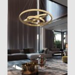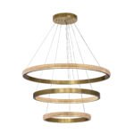 Aliuminis rėmas su aukso spalvos korpusu. Šviestuvo pakabinimo laidų ilgis 200 cm. Aukštį galima reguliuoti pagal poreikį. Šviestuvų žiedų matmenys – 85 + 65 + 45 cm. Išskirtinis interjero akcentas, kuris papuoš Jūsų svetainės ar kito kambario interjerą.