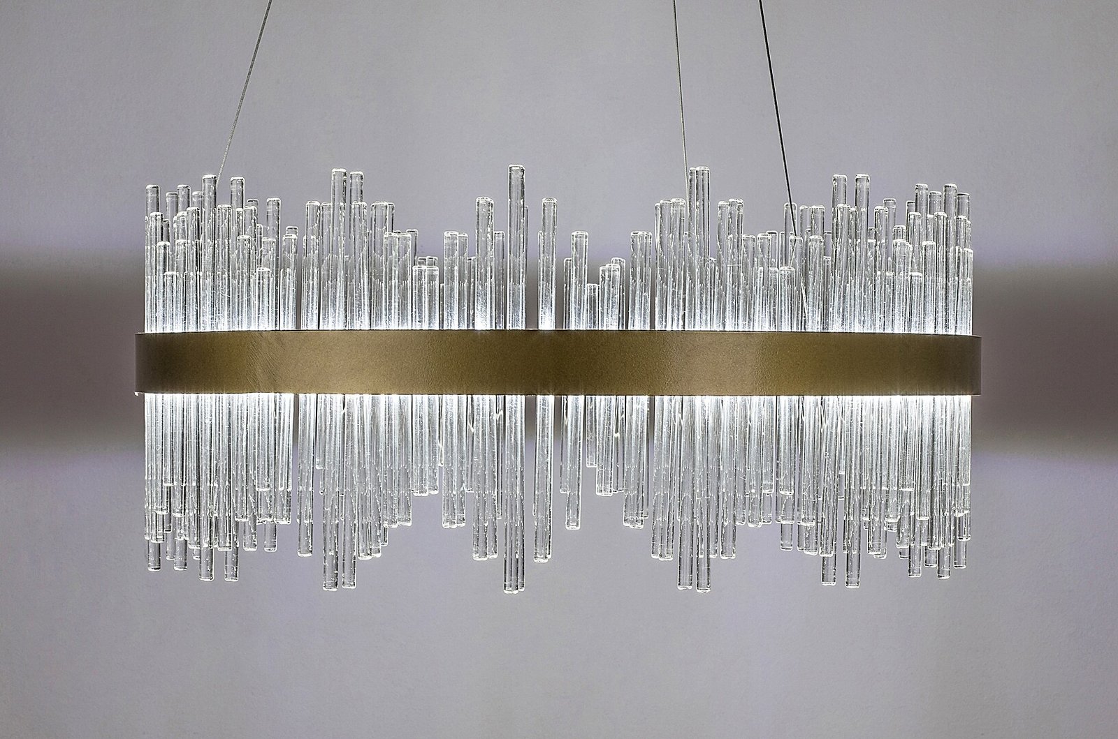 Aukso spalvos metalinį šviestuvą papildo permatomo stiklo gaubtas, jį galima pritvirtinti prie lubų apvalaus dekoratyvinio pagrindo pagalba. Žvaigždėtas pakabukas sudarytas iš aukso spalvos žiedo formos elemento ir iš jo aukštyn-žemyn kyšančių cilindrinių dalių, primenančių spindinčius varveklius.