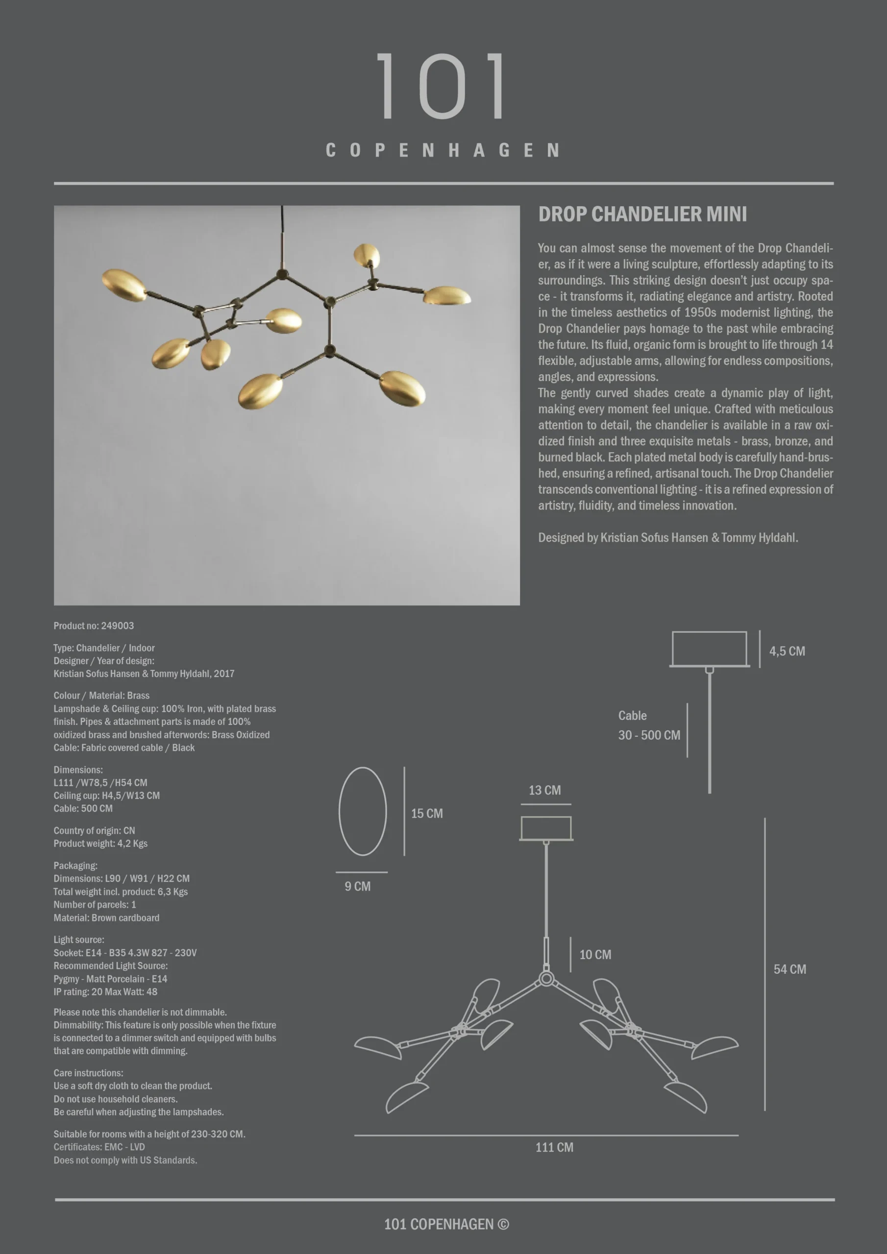 Beveik pajusite Lašelio liustra judėjimą. Kaip laisvai tekanti skulptūra, ji užima erdvę ir reikalauja savo gyvenimo. Kolekcija „The Drop Chandelier“ pagerbia modernistinį šeštojo dešimtmečio lempų dizainą, ji taip pat švenčia eksperimentinį, novatorišką požiūrį su švelniai lenktais atspalviais ir 14 lanksčių ir funkcionalių reguliuojamų rankenų, sukuriančių daugybę variantų, variantų ir kampų. Gražiai pagamintas žalvaris ir metalinis korpusas vėliau yra šepetys rankomis, o lempa elegantiškai apšviečia kambarį šilta, malonia šviesa.