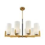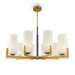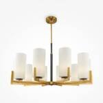 Pakabinamas šviestuvas metalo korpusu ir baltais stiklo gaubtais.