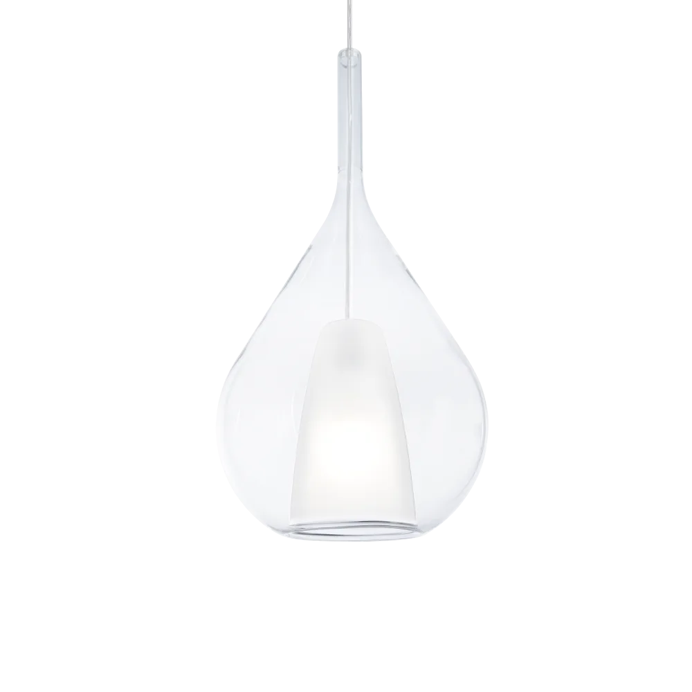 Magnetinis chromuoto metalo lubų dangtelis. Difuzorius su dvigubo pūtimo borosilikatinio stiklo stiklu: vienas vidinis satininis, vienas išorinis skaidrus su įvairiomis apdailomis. PVC laidas. Stiklo spalvos: gintaro, šviesiai mėlyna, dūminė, skaidri arba vario.