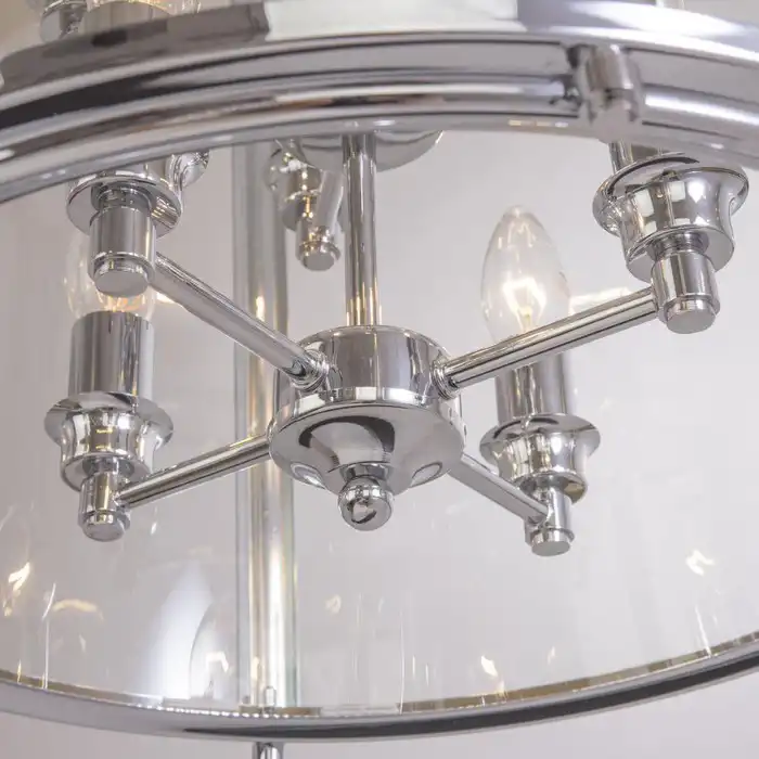 Elegantiškas, drąsus. Žibintas arba dėl savo dydžio gyvenamųjų namų ir daugiaaukščių butų žibintas. Šis pakabinamas šviestuvas bus aukštesnė nei vidutinė bet kokio išskirtinio interjero, išlaikyto klasikiniu stiliumi, puošmena. Jis pagamintas iš chromuoto plieno ir stiklo, o jo dydis ir 8 šviesos šaltiniai puikiai apšvies ir pabrėš interjero charakterį.