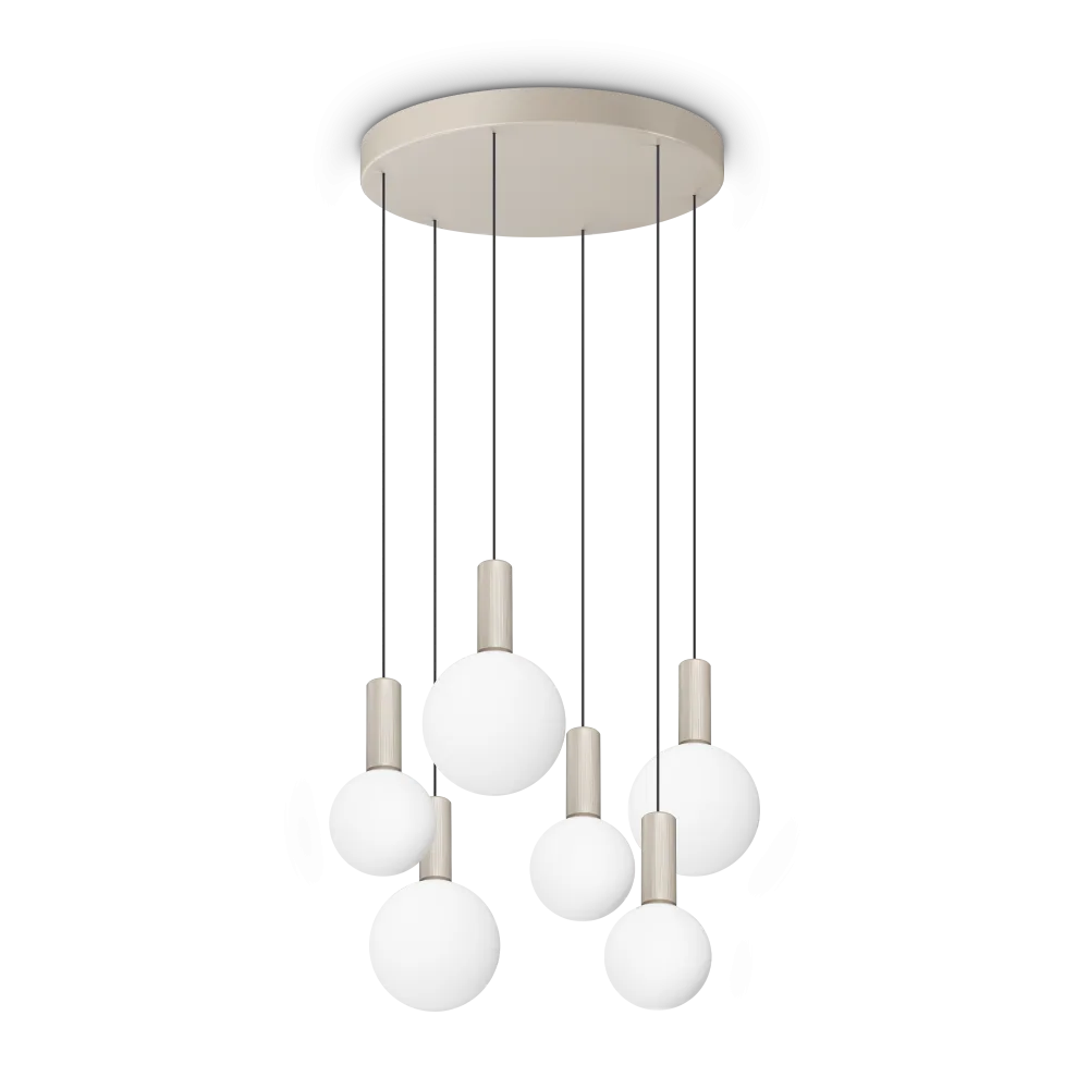 Magnetinis lubų dangtelis iš matinio metalo. Cilindrinis metalinis rėmas su dryžuotais raštais. Difuzoriai iš balto ėsdinto pūsto stiklo. Juodi PVC laidai.