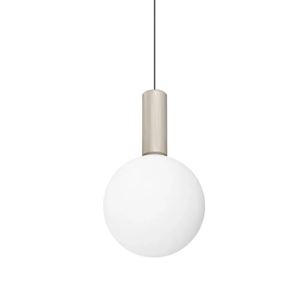 Magnetinis lubų dangtelis iš matinio metalo. Cilindrinis metalinis rėmas su dryžuotais raštais. Difuzoriai iš balto ėsdinto pūsto stiklo. Juodi PVC laidai.