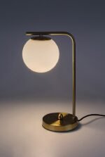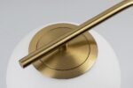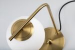 Aukso spalvos metalinį šviestuvą papildo balto stiklo gaubtas, o liekna, lenkta šviestuvo rankena baigiasi apvaliu aukso spalvos dekoratyviniu pagrindu.